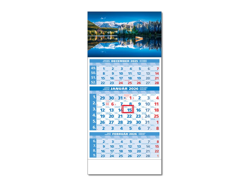 Plánovací 3-mesačný modrý kalendár s priloženou hornou čistou lištou, s menami v SK + CZ, názvy mesiacov a dní v SK, CZ, UK, DE a HU. . Možnosť výberu obrázku. Obrázok BDodatočné parametre