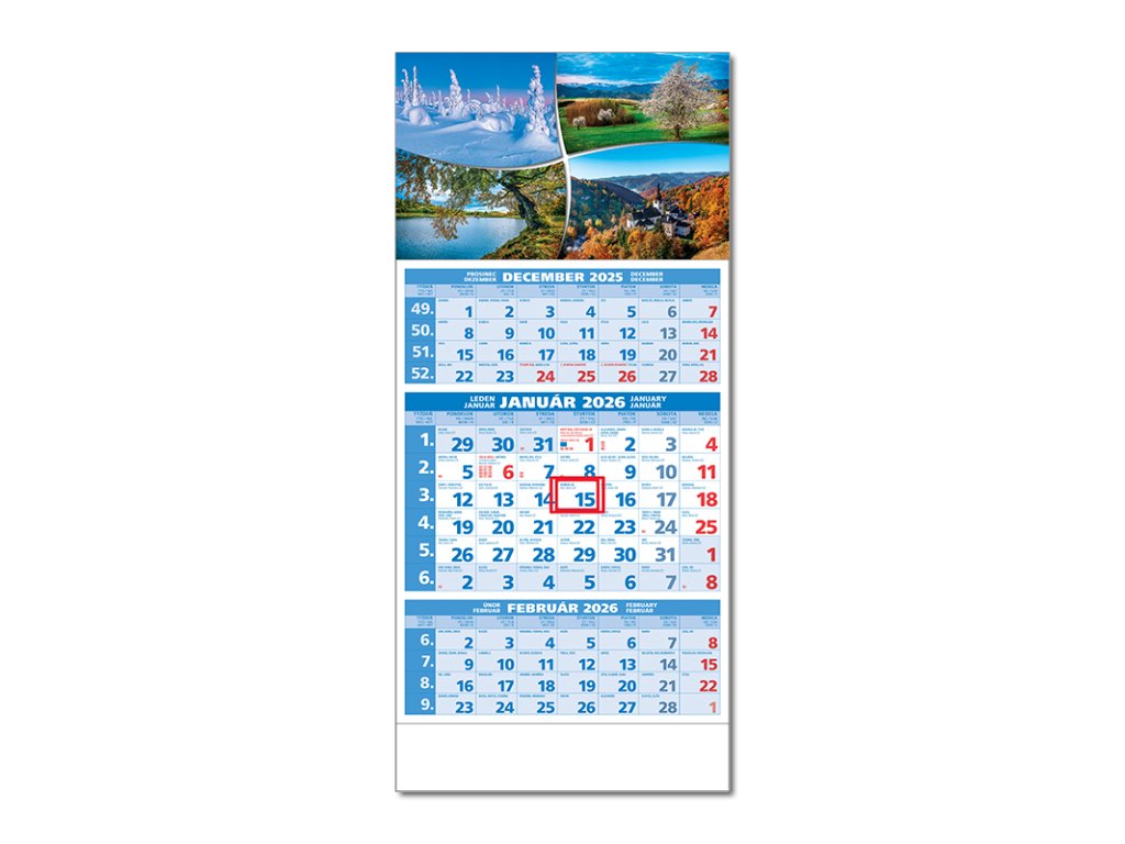 Plánovací 3-mesačný modrý kalendár s priloženou hornou čistou lištou, s menami v SK + CZ, názvy mesiacov a dní v SK, CZ, UK, DE a HU. . Možnosť výberu obrázku. Obrázok DDodatočné parametre