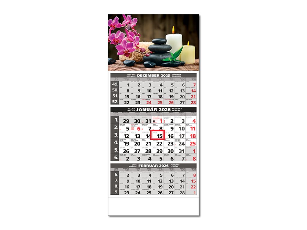 Plánovací 3-mesačný sivý kalendár s priloženou hornou čistou lištou, s menami v SK + CZ, názvy mesiacov a dní v SK, CZ, UK, DE a HU. Možnosť výberu obrázku. Obrázok GDodatočné parametre