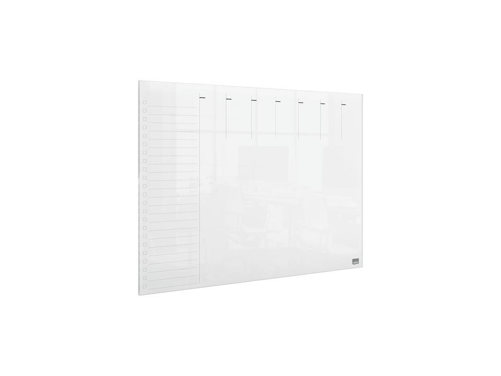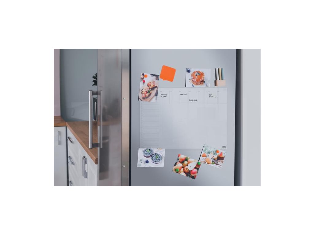 Tento týždenný plánovač do domácej kancelárie je vďaka svojmu modernému bezrámovému dizajnu a týždennej mriežke ideálny na zapisovanie poznámok, myšlienok, nápadov a dôležitých dátumov. Vďaka samolepiacim podložkám a magnetom ho možno použiť ako nástennú tabuľu, keď sa pripevní na kovový povrch, alebo ako tabuľu, keď sa položí na stôl alebo inú pracovnú plochu. Vďaka priehľadnému dizajnu pripomienková tabuľa splynie s okolím, keď sa nepoužíva. Jej povrch so suchou gumou sa ľahko udržiava v čistote, stačí na ňu písať, utrieť ju a začať znova. Súčasťou balenia je: 1 pero na bielu tabuľu. Veľkosť: A3.