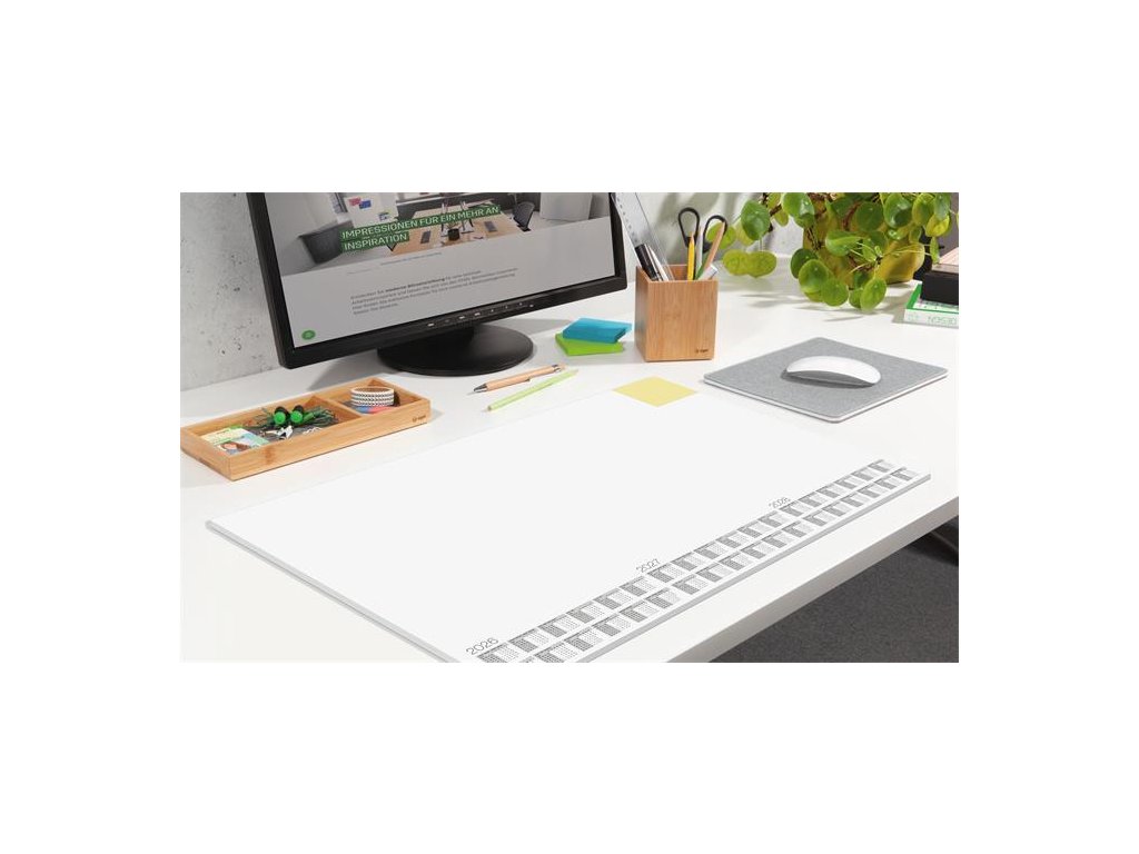 s trojročným kalendárom (2026/2027/2028) -štvorjazyčný: angličtina, nemčina, francúzština a holandčina -veľkosť: približne A2 -odolný, protišmykový a vďaka masívnej kartónovej zadnej doske úplne rovno leží -použiteľný aj ako podložka pod myš -30 listov -farba: biela -s certifikátom FSC