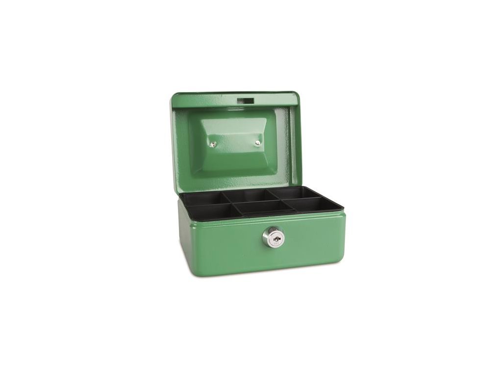 Uzamykateľná kovová pokladnička na peniaze s lakovaným povrchom - zásobník na mince - zaoblené rohy - rukoväť na prenášanie - 2 ks kľúčov - rozmer: 152x115x80 mmDodatočné parametre