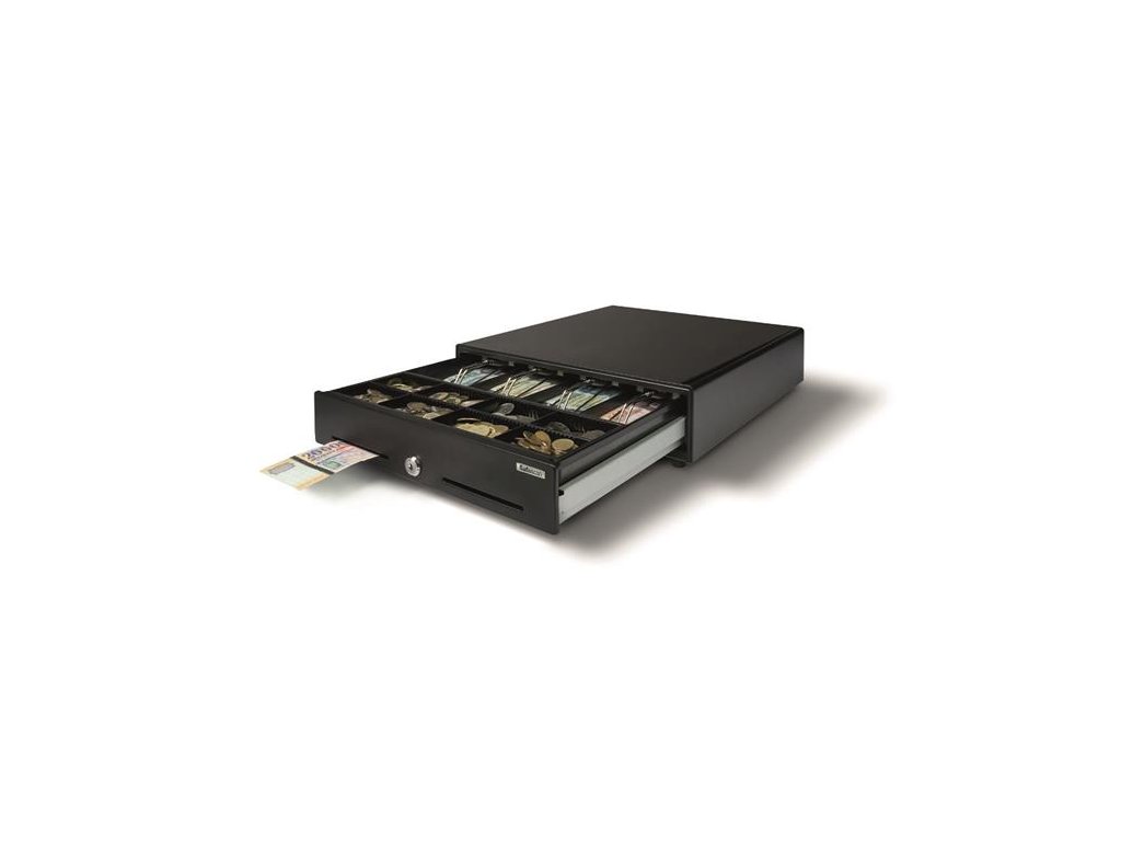 robustné kolieska s ložiskami a štipce na bankovky nastaviteľná a vyberateľná vnútorná priehradka 4 úložné miesta na bankovky / 8 na mince oddelený priestor pre ukladanie veľkých súm a cenných papierov elektronické a manuálne otváranie „easy-push“ 3 polohový zámok (zamknutý, odomknutý, pohotovostný) podpora: RJ12 port testované: 1 000 000 otvorení hmotnosť: 5,3 kgDodatočné parametre