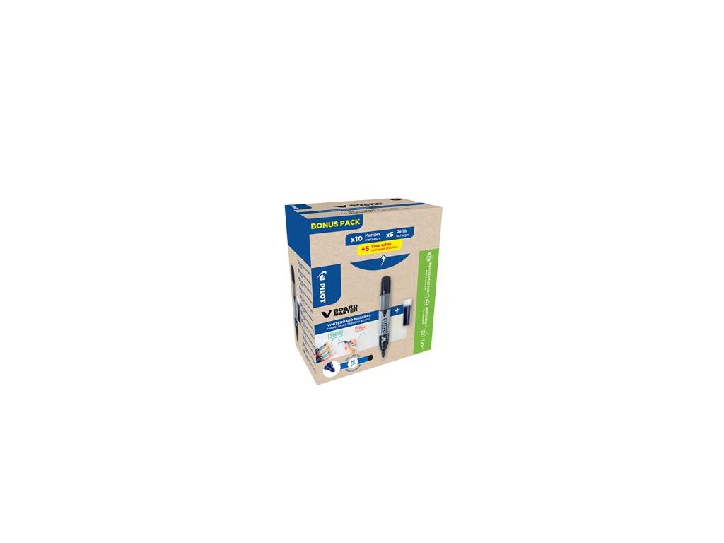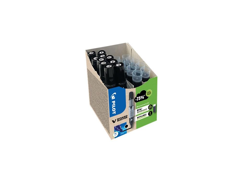 Jednou z technických noviniek spoločnosti PILOT je V-BOARD MASTER: Budete potešení intenzitou a viditeľnosťou farieb (viditeľnosť až do 20 metrov) - Fixka na tabuľu tekutým atramentom -TPF systém: dve paralelné trubice riadia prúdenie vzduchu a tým aj prívod atramentu -bez pretrepania, je možné ihneď použiť -Hladké, nepretržité písanie -môže utrieť do sucha -Extrémne odolný, ale ľahko vymazateľný -okrúhla špička -jasné a žiarivé farby -91% vyrobené z recyklovaných materiálov (okrem vymeniteľných častí) - špička z akrylového vlákna - zreteľne viditeľná spotreba atramentu vďaka jeho priehľadnému telu -náhradná náplň: PBMTBFKDodatočné parametre