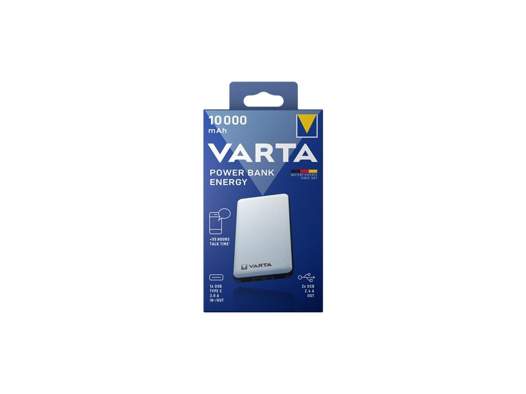 Výkonná Power Banka s kapacitou 10000mAh. Vstupy: Micro USB 5V/2A, USB typ C 5V/3A. Výstupy: USB 5V/2,4A (2x), USB typ C 5V/3A. 4 biele LED diódy indikujúce stav nabitia. Štýlový textúrovaný dizajn s logom VARTA,. Možnosť nabíjania až 3 zariadenia súčasne. Súčasťou balenia je čierny 50 cm USB kábel. Hmotnosť 233 g.Dodatočné parametre