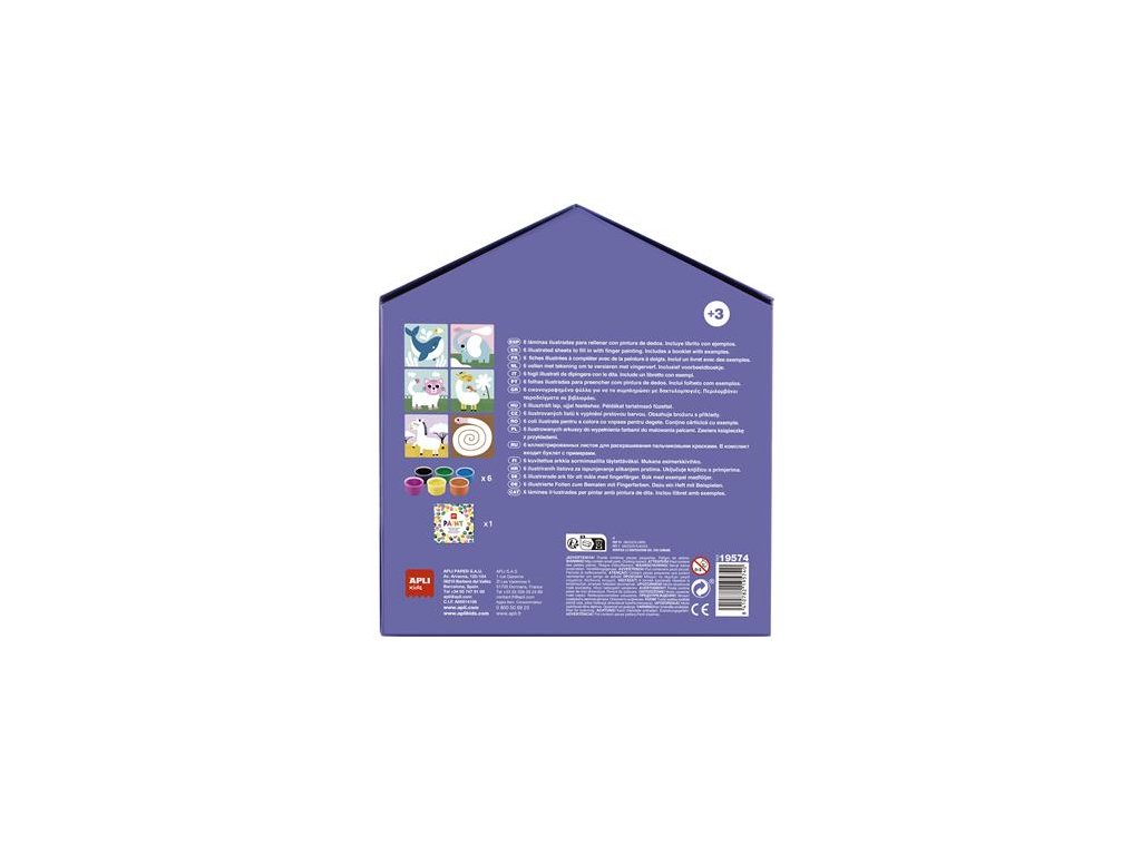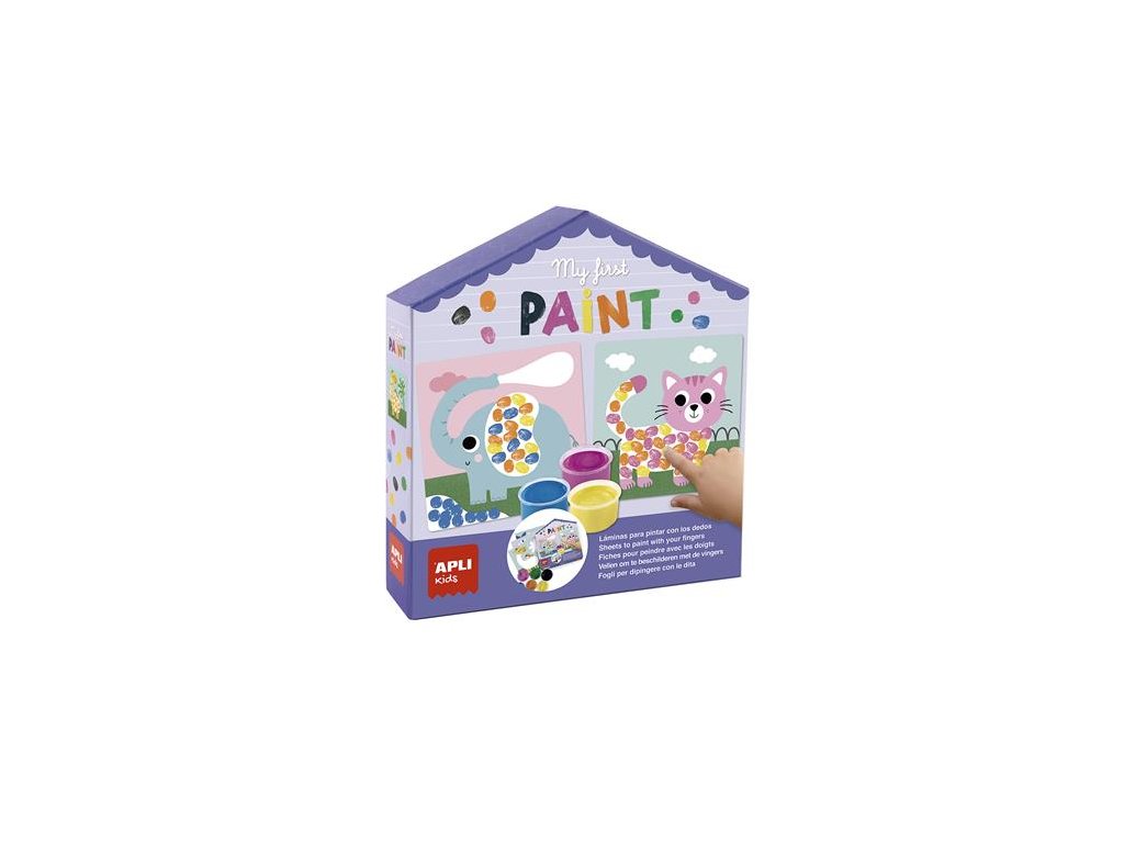 APLI KIDS: Maľovanie z kolekcie My First s motívom zvieratiek. Hra spočíva v tom, že prstami vymaľujete plochy vyznačené na obrázkoch. Súprava obsahuje: - 6 prstových farieb v rôznych farbách (žltá, oranžová, ružová, modrá, zelená, čierna) - 6 ilustrovaných kartičiek na vymaľovanie - návod.