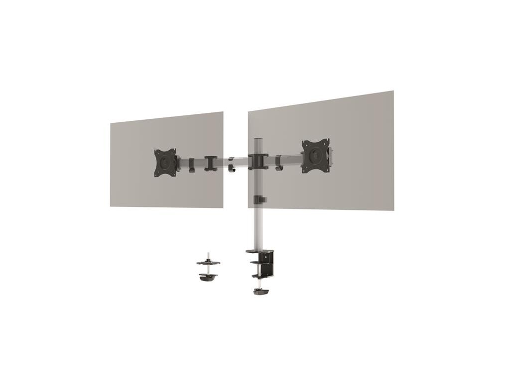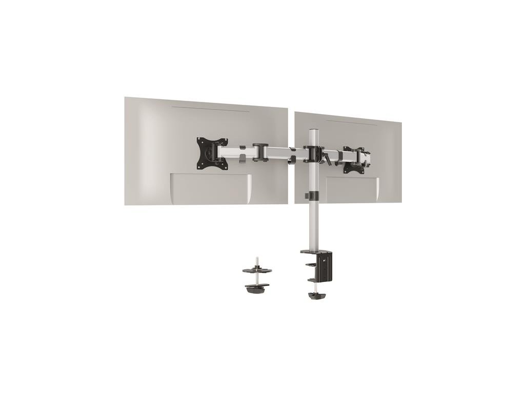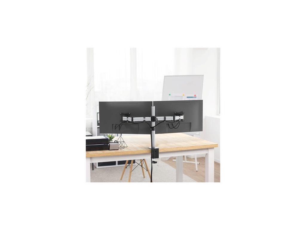 Držiak monitora na 2 obrazovky, s jedinečnou možnosťou montáže, pomocou skrutky a stolovej svorky -ergonomická práca vďaka individuálnemu a jednoduchému nastaveniu výšky, sklonu a polohy monitorov -možno ho jednoducho otáčať o 360°, takže používajte monitor pohodlne aj v režime na výšku alebo na šírku - ramená sú pomocou troch pántov, dajú sa vysunúť až o 36 cm a otočiť až o 180° - výšku obrazoviek možno plynulo nastavovať na 45 cm stĺpe - s univerzálnou štandardnou veľkosťou VESA (75 x 75 mm alebo 100 x 100 mm) - veľkosť 27" a 8 kg - pre štandardné monitory do max.Dodatočné parametre