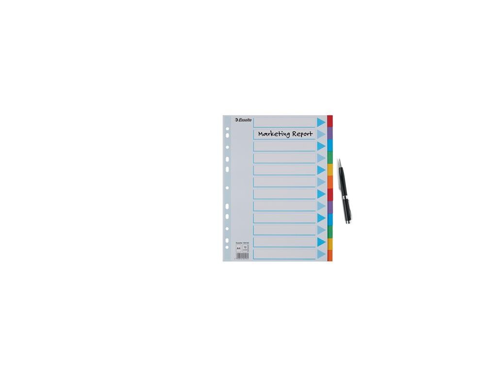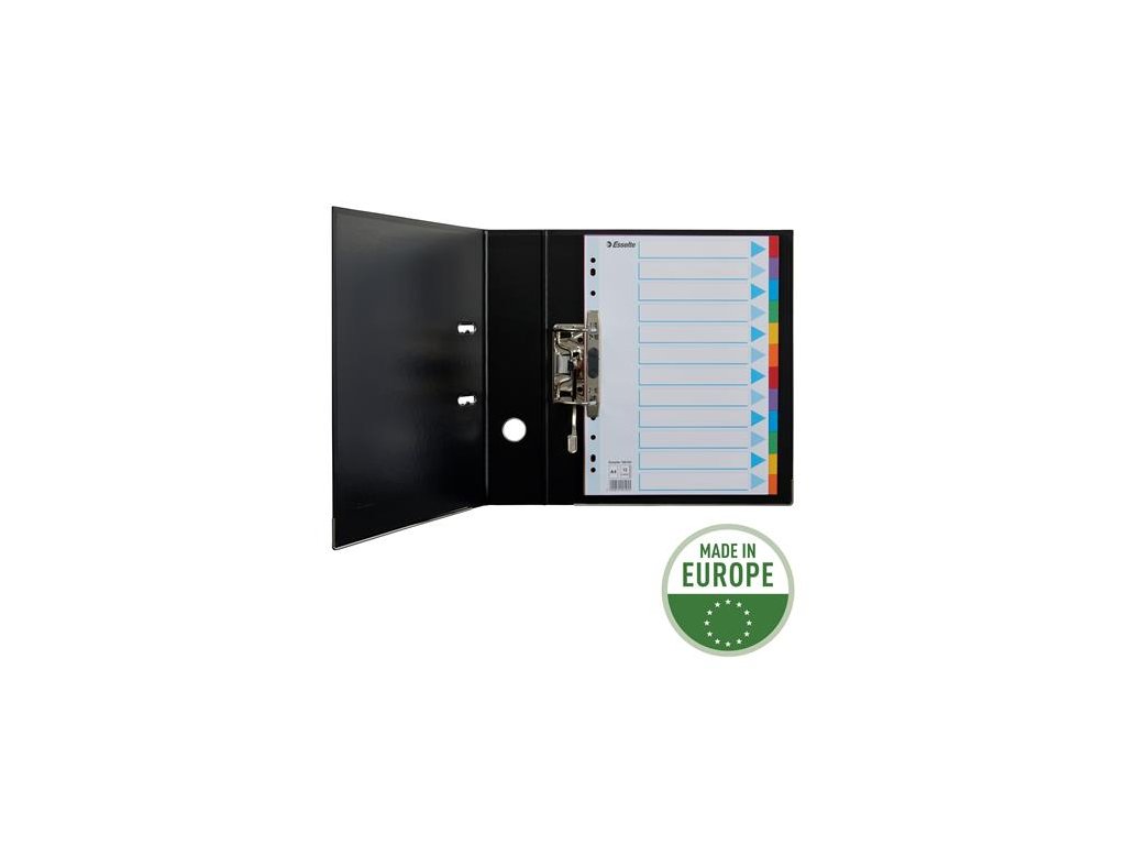formát: A4 praktické riešenie pre triedenie dokumentov popisovateľná predná strana odolný recyklovaný kartón, 160 g/m2 farebné listy počet dier: 11 Značka: ESSELTE Výrobca: Esselte Kft. Adresa: 1139 Budapest, Lomb u. 37-39. A ép. II. 8., Hungary Web: https://www.accobrands.com/brands/ Email: hungarymarketing@acco.comDodatočné parametre