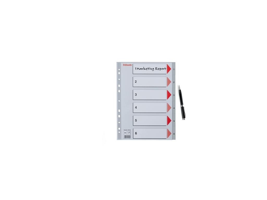 - farba: sivá - univerzálna multiperforácia (11 dier) pre založenie do pákového i krúžkového šanóna - 6 deliacich listov so štítkami 1-6 pre rýchlu orientáciu v obsahu - vyrobený z Polypropylénu (PP) hrúbky 0,12 mm - spevnená multiperforácia plastovým prúžkom na titulnej strane - rozmer: 225 x 297 mm Značka: ESSELTE Výrobca: Esselte Kft. Adresa: 1139 Budapest, Lomb u. 37-39. A ép. II. 8., Hungary Web: https://www.accobrands.com/brands/ Email: hungarymarketing@acco.comDodatočné parametre