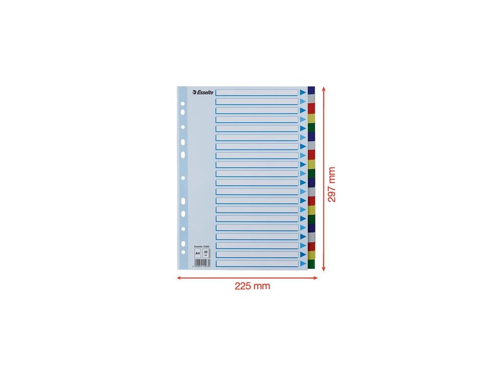 formát: A4 praktické riešenie pre triedenie dokumentov 0,12 mm kvalitný plastový materiál počet dier: 11 Značka: ESSELTE Výrobca: Esselte Kft. Adresa: 1139 Budapest, Lomb u. 37-39. A ép. II. 8., Hungary Web: https://www.accobrands.com/brands/ Email: hungarymarketing@acco.comDodatočné parametre