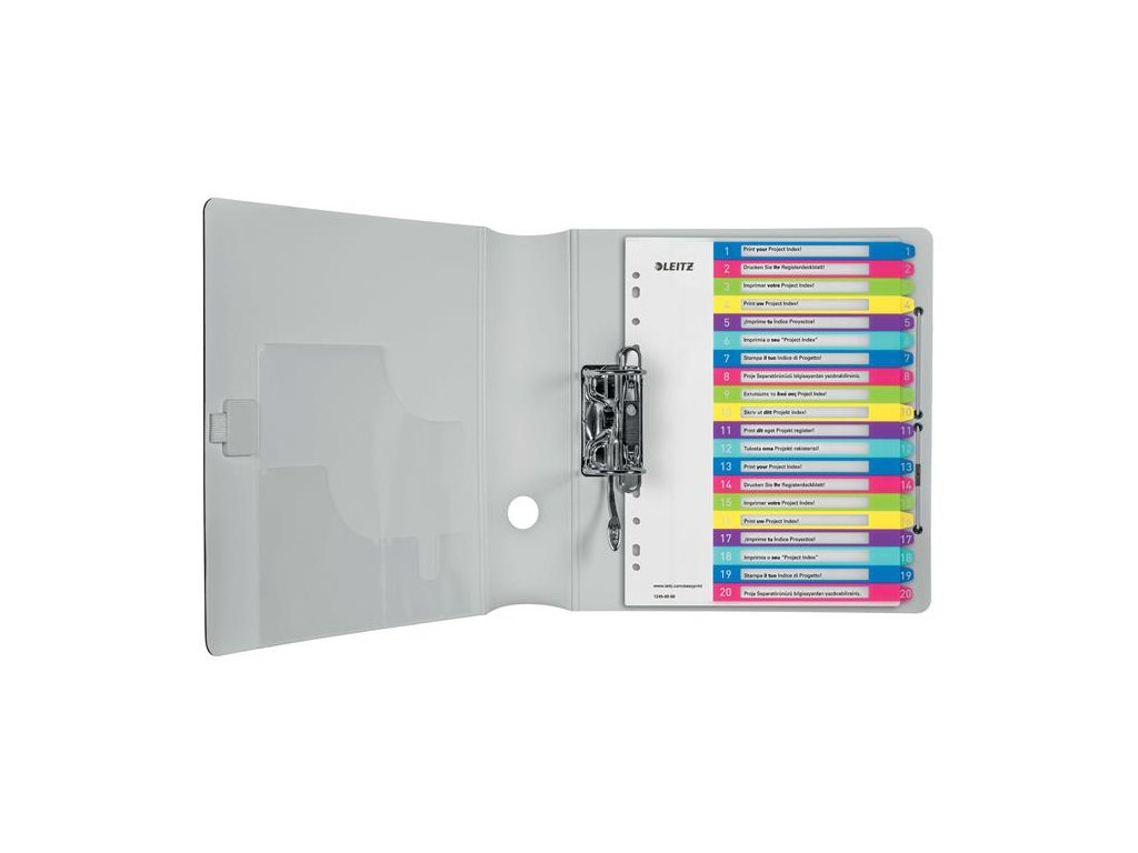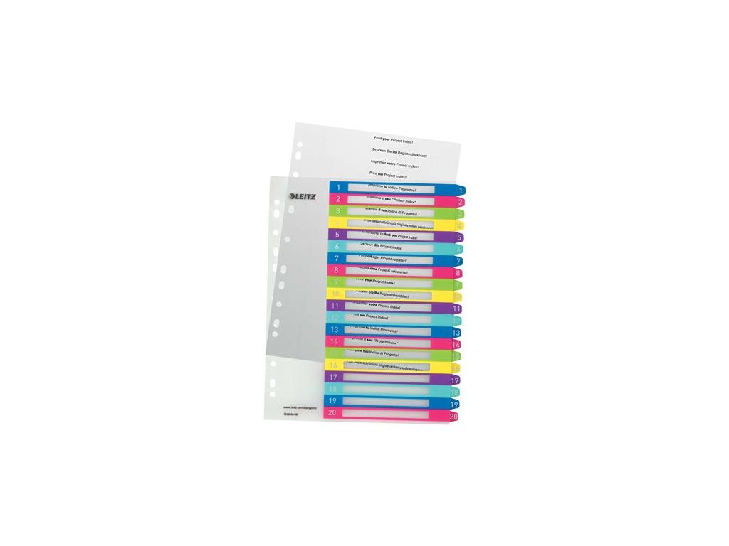 - rôznofarebný register - veľké obdĺžniky na prednej strane na uvedenie obsahu - registre s označením 1-20 na rýchly dosah dokumentov, povrch vhodný na tlač - posilnená časť zakladania na prednej starne - 11 dier - 0,3 mm hrubý polypropylénový materiál - rozdeľovače formátu A4+ sú širšie než štandardné euroobaly, preto zakladané dokumenty možno ľahko triediť - vypracujte a vytlačte vlastný vecný register pomocou programu, ktorý nájdete na webstránke: www.leitz.com/easyprint Značka: LEITZ Výrobca: Esselte Kft. Adresa: 1139 Budapest, Lomb u. 37-39. A ép. II. 8., Hungary Web: https://www.accobrands.com/brands/ Email: hungarymarketing@acco.comDodatočné parametre