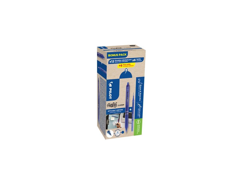 Napíš...vymaž...prepíš: Vymaž svoje písanie pomocou špeciálnej gumy FriXion s použitím tepla generovaného trením, bez toho, aby ste na papieri zanechali zvyšky gumy alebo stopy. Vďaka novému atramentu citlivému na teplo spôsobil PILOT – verný svojim tradíciám – opäť revolúciu v písaní s FriXion Clicker! - pero mladistvého štýlu - efektívne telo a vzor tetovania - dostupné vo viacerých farbách - neodporúča sa na písanie a podpisovanie úradných dokumentov - hrúbka písma: 0,35 mm - priemer guľôčky: 0,7 mm - vymeniteľná náplň: PFRBK2 - Obsah Bonus Obsah Pack balenia: 12 "Frixion Clicker "0,35 mm, tlačidlové rollerové pero, modré (PFCR07K) + 2 bal "Frixion Ball/Clicker" 0,35 mm náplň do rollera, modrá (PFRBK2S6)Dodatočné parametre