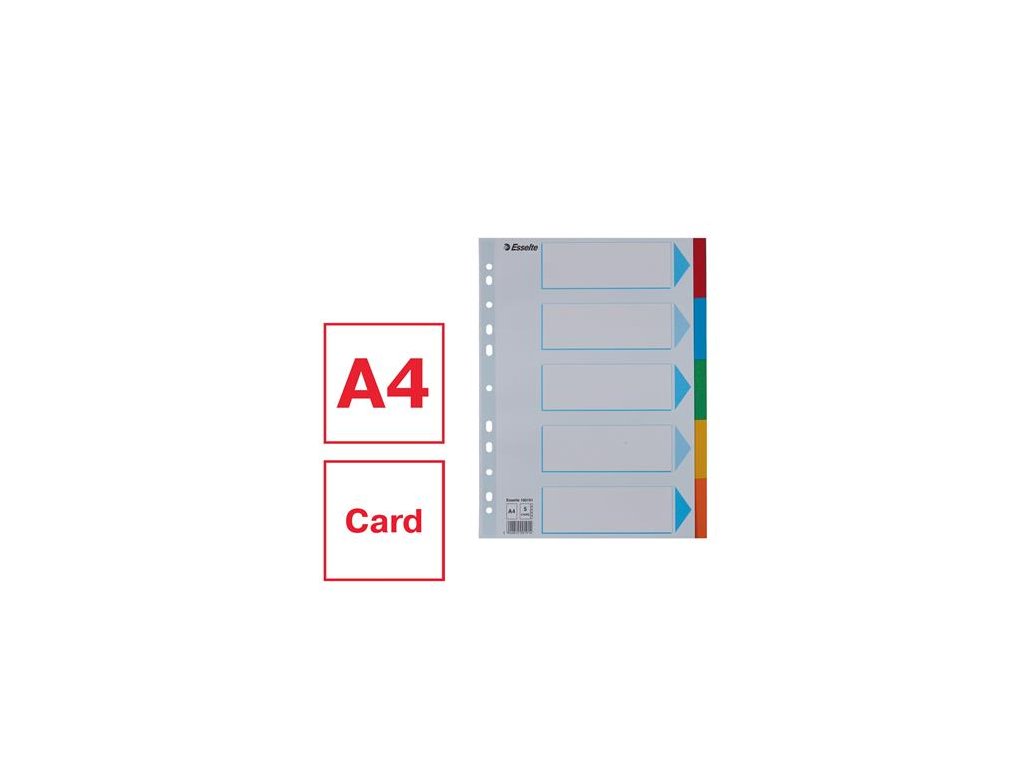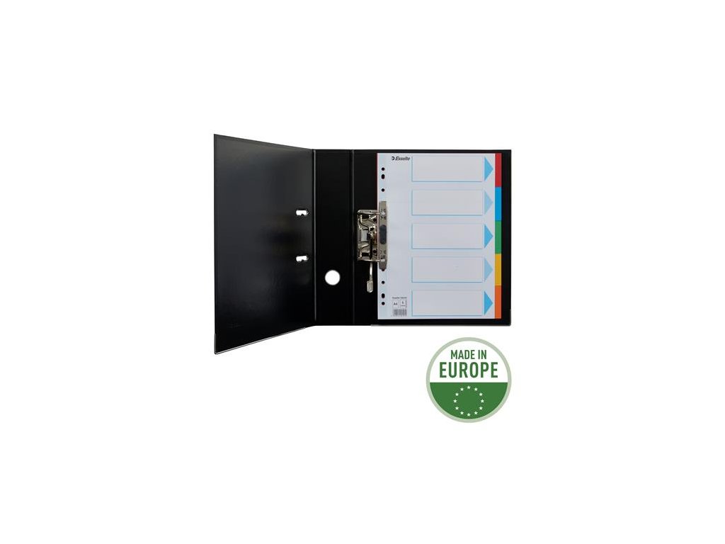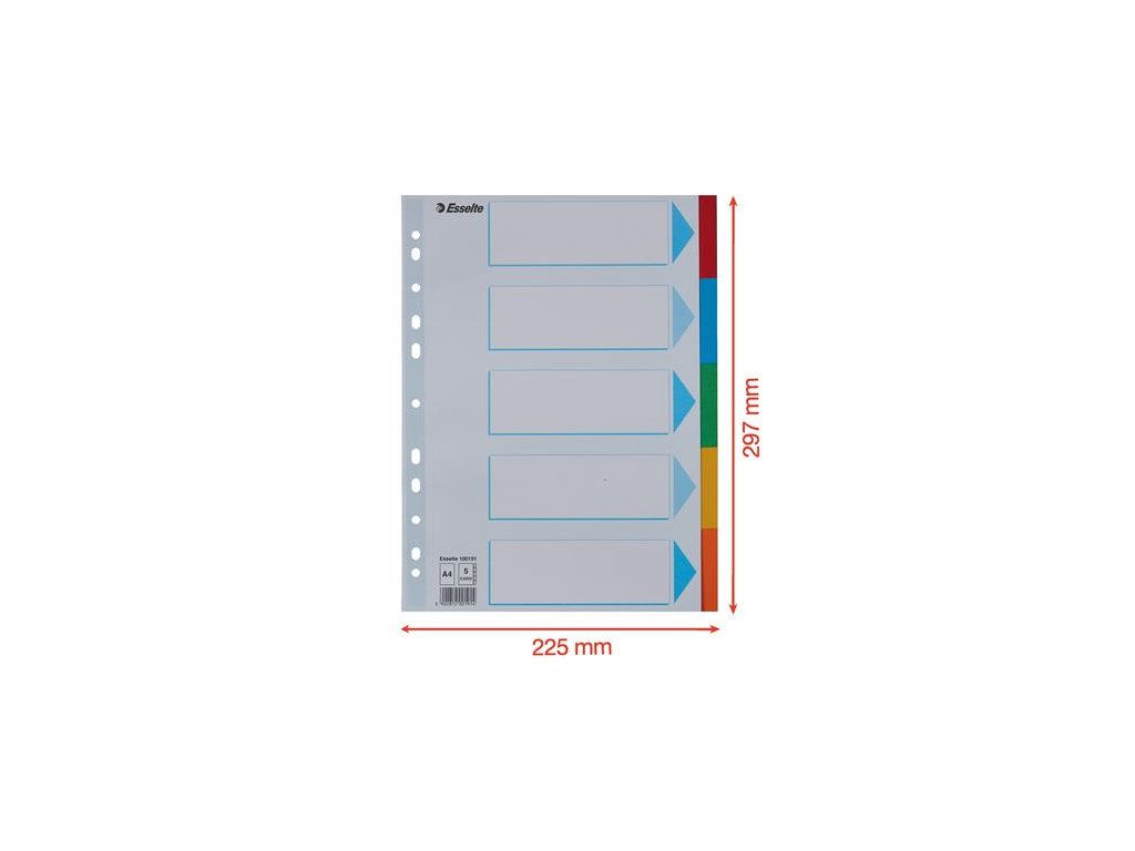 Rozlišovače zo silného recyklovaného kartónu pre triedenie dokumentov v zoraďovačoch či doskách do formátu A4, s popisovateľnou titulnou stranou, jednotlivé stránky v rôznych farbách, 5 dielov, univerzálna multiperforácia (11 dier) pre založenie do pákového i krúžkového zoraďovača Značka: ESSELTE Výrobca: Esselte Kft. Adresa: 1139 Budapest, Lomb u. 37-39. A ép. II. 8., Hungary Web: https://www.accobrands.com/brands/ Email: hungarymarketing@acco.comDodatočné parametre