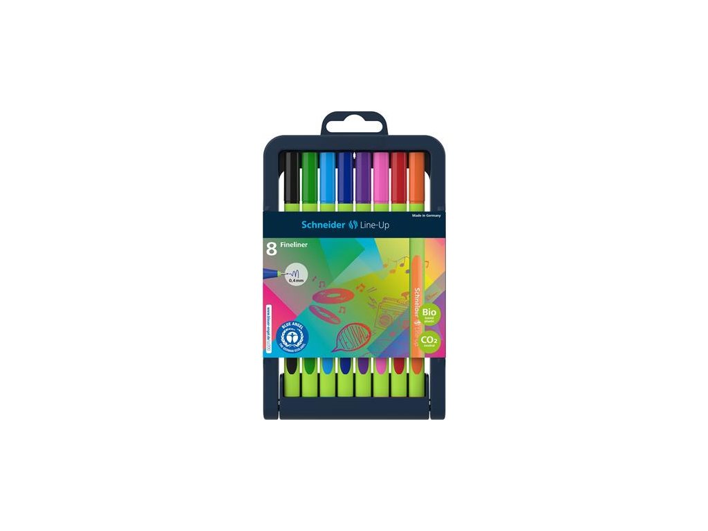 tenké a presné písmo plynulé písmo vďaka nehrdzavejúcemu hrotu atrament na báze vody zelené plastové telo telo v 88% z plastu s BIO základom gumované, trojuholníkové telo pera koniec pera sa zhoduje s farbou atramentu hrúbka písma: 0,4 mm 30 rôznych farieb astaviteľný držiak na linery vyrobený z recyklovaného plastu sada obsahuje 8 linerov v rôznych farbáchDodatočné parametre