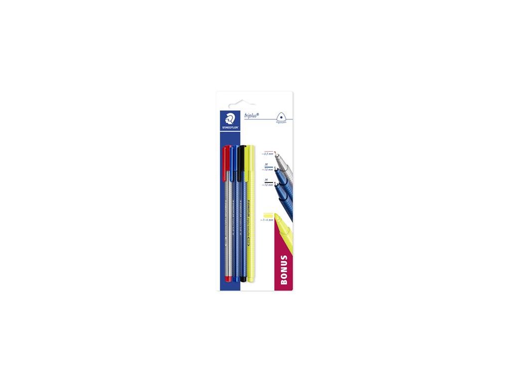 Sada Triplus, ktorá obsahuje 1 ks tenkého fixu (0,3 mm) v červenej farbe, 2 ks guľôčkových pier (M) v modrej a čiernej farbe a 1 ks žltého zvýrazňovača (1-4 mm).