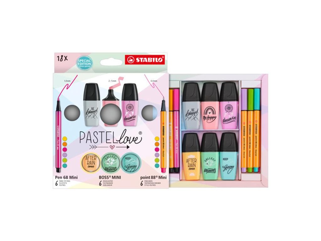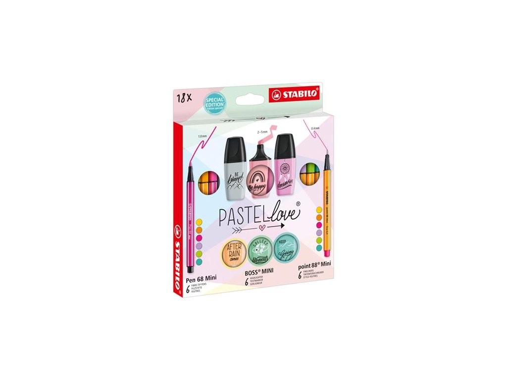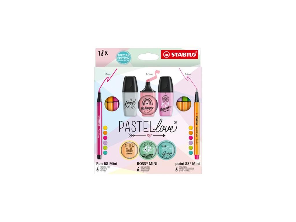 Limitovaná sada z kolekcie STABILO "Pastellove"! - V 18-kusovej sade "Mini World Pastellove" je 6 najkrajších odtieňov linerov "point 88 Mini", fixiek "Pen 68 Mini" a zvýrazňovačov "BOSS Mini Pastellove 2.0" - obsah sady: "point 88 Mini" farby 688/44, 54, 56, 59, 33,13; "Pen 68 Mini" farby 668/44, 54, 56, 59, 33, 13 a "BOSS Mini Pastellove 2.0 07/113-9, 116-9, 125-9, 129-9, 158-9, 194-9 farby Značka: STABILO Výrobca: STABILO international GmbH Magyarországi Fióktelepe Adresa: 1033 Budapest, Szőlőkert köz 7/a., Hungary Web: www.stabilo.hu Email: info.hu@stabilo.comDodatočné parametre