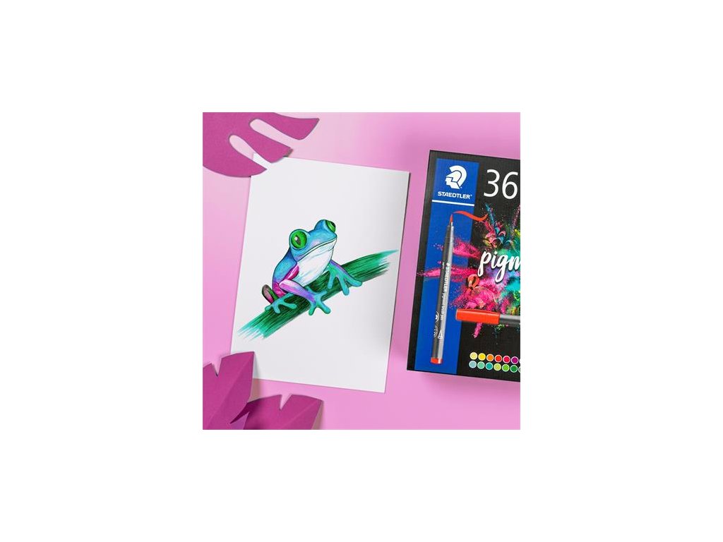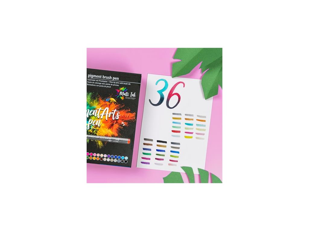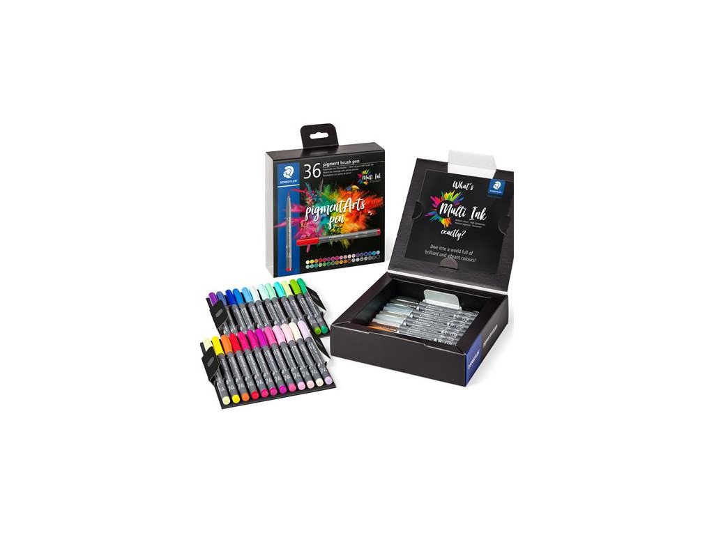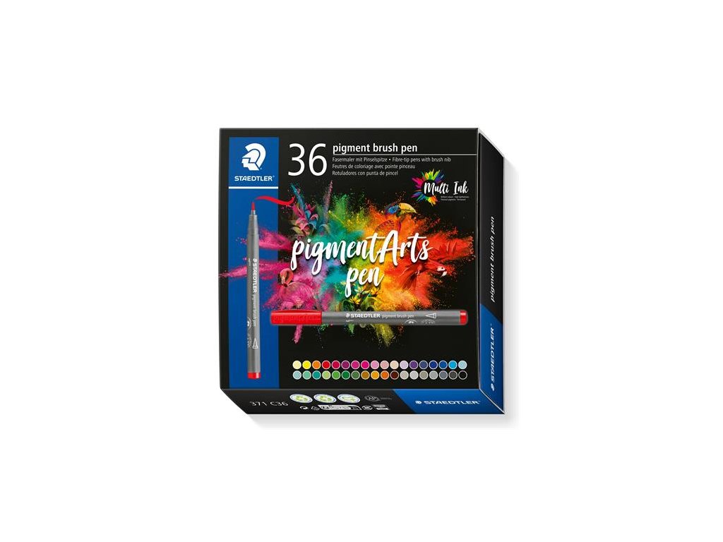 Urobte umelecké diela žiarivými - Buďte MULTI kreatívni! Inovácia pre farebnú a udržateľnú budúcnosť - nová kolekcia štetcových a fixkových pier STAEDTLER "Pigment arts" spája jedinečnú "Multi Ink" atramentovú technológiu, ktorá kombinuje výhody farbiaceho a pigmentového atramentu: žiarivé farby, mimoriadna svetlostálosť pre trvácne výsledky