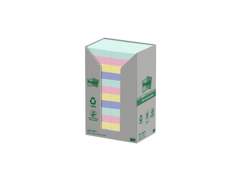 Samolepiaci bloček, 38x51 mm, 24x100 listov, ekologický, 3M POSTIT "Nature", mix pastelových farieb