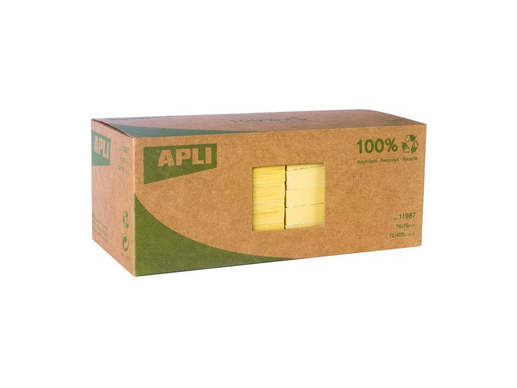 Samolepiaci bloček, 75x75 mm, 100 listov, z recyklovaného papiera, APLI, žltý