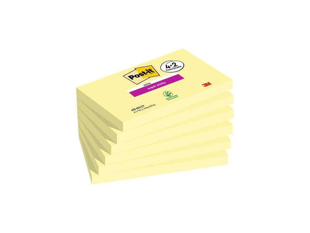 Samolepiace bločky Post-it® Super Sticky sú dvakrát pevnejšie ako originálne bločky Post-it®. -rýchle písanie poznámok, najpohodlnejší spôsob odosielania správ a písanie pripomienok -ideálne pre zvislé alebo ťažko priľnavé povrchy, ako sú monitory, dvere alebo steny -materiál lepiaceho bloku Post-it® Super Sticky je PEFC - certifikované papierové vlákno z trvalo udržateľného lesného hospodárstva a kontrolovaných zdrojov - lepidlo z obnoviteľného zdroja, ktoré je vyrobené zo 60% viacročných rastlín - ich kanárikovo žltá farba je ideálna na zapisovanie poznámok alebo posielanie správ a pripomienokDodatočné parametre