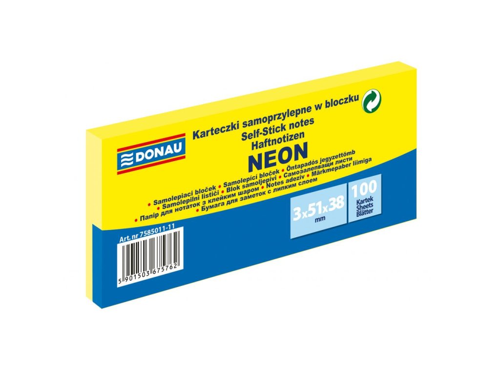 Univerzálne neónové samolepiace bločky z papiera gramáže 70 g / m², 100-lístkové, jednotlivo balené. Lepidlo nanesené po dlhšej strane, zmývateľné vodou. Udelený Green Point. 3 bločky vo fólii s červeným pruhom na uľahčenie otvárania. Väčšie balenie 36 ks. Farba neónovo žltá.Dodatočné parametre