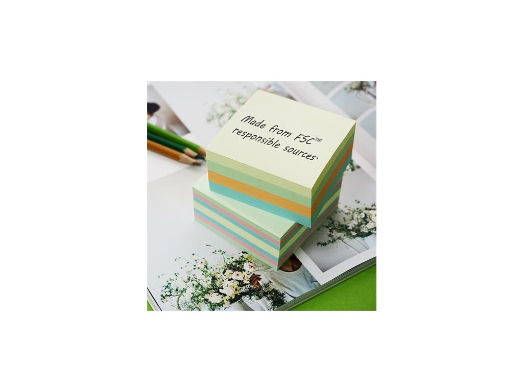 Ekologický, FSC certifikovaný – vyrobený z papiera pochádzajúceho zo zodpovedného lesného hospodárstva – samolepiaci blok v tvare kociek – 100% vodou rozpustné lepidlo – lepidlo je možné bez zvyškov odstrániť – licenčný kód: FSC™ C107256.Dodatočné parametre