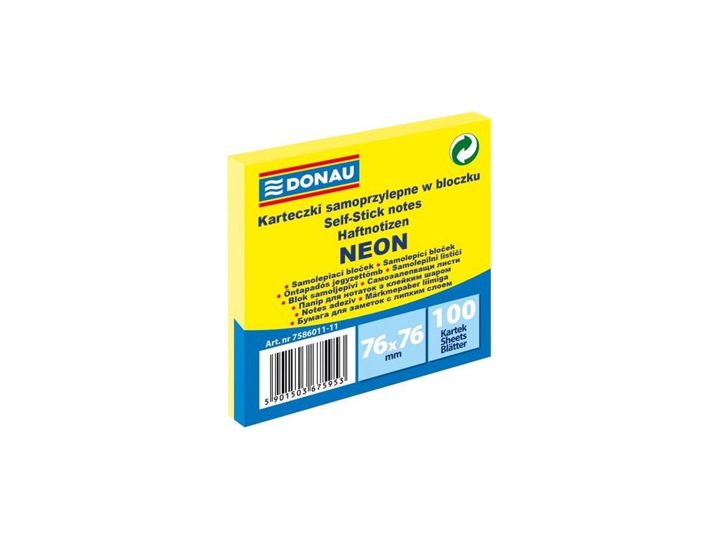 Samolepiaci poznámkový blok, 76x76 mm, 100 listov, DONAU, neónovo žltá
