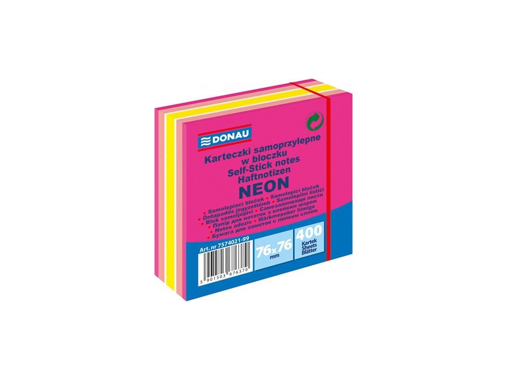 Samolepiaci poznámkový blok, 76x76 mm, 400 listov, DONAU, neónovo-pastelový mix, odtiene ružovej