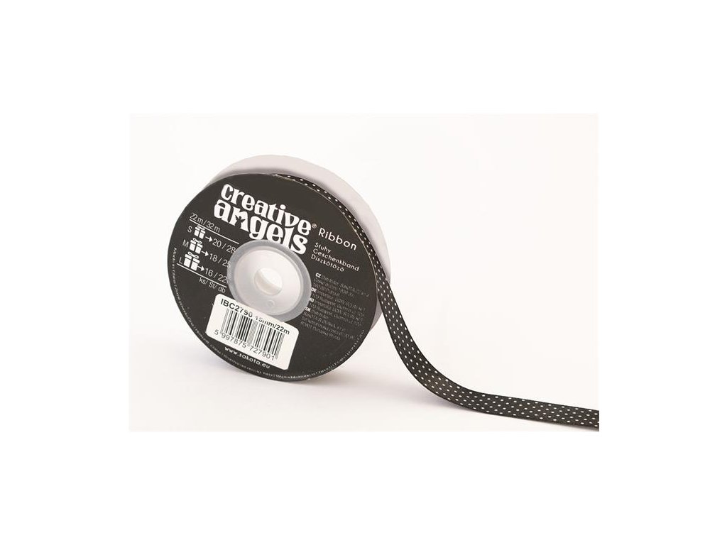 Saténová stuha, 15 mm x 22 m, čierna s bielymi bodkami
