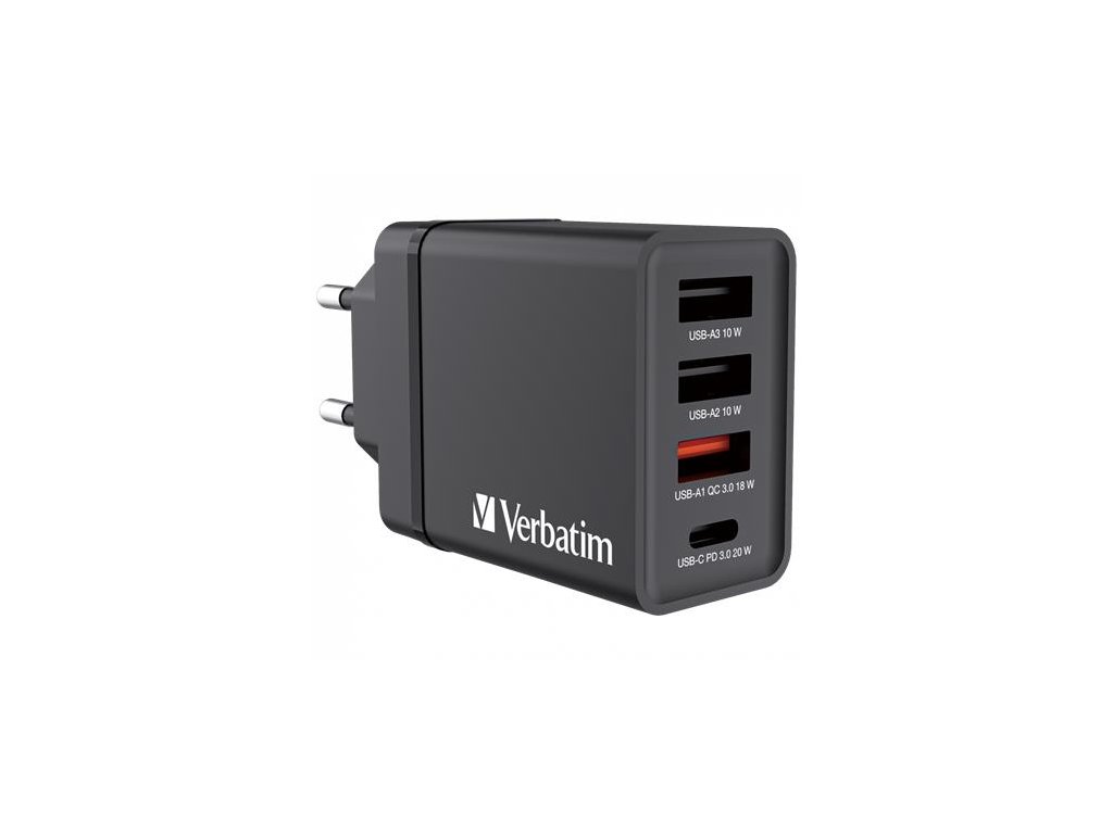 Sieťová nabíjačka, 1xUSB-C PD (20W), USB-A QC 3.0, 2xUSB-A (10W), VERBATIM, čierna