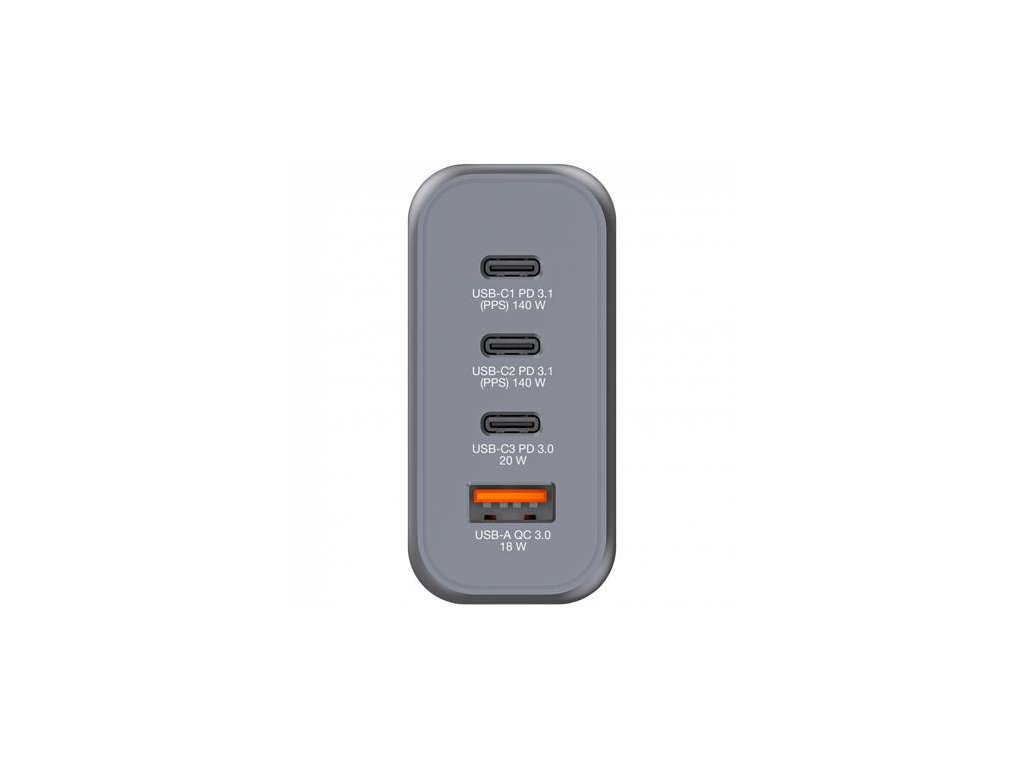 Podporuje súčasné nabíjanie až 4 zariadení (s maximálnym výkonom 140 W). So svojimi skladacími americkými stopkami a vymeniteľnými zástrčkami pre EÚ a Spojené kráľovstvo je dokonalým spoločníkom na cesty. -Galium Nitride (GaN) technológia: poskytuje vysoký výkon, rýchle a efektívne nabíjanie a produkuje menej tepla -2 x USB-C® PD 3.0 až 140 W -1 x USB-C® PD 3.0 až 20 W -1 x USB -A QC 3.0 až 18 W - super rýchle nabíjanie pomocou USB Power Delivery 3.0, PPS a Quick Charge 3.0 - technológia programovateľného napájania (PPS) poskytuje správne množstvo energie potrebnej pre ideálne nabíjanie - vyrobené z vysoko kvalitného plameňa -odolné materiály - nadprúdová ochrana -prepäťová ochrana -ochrana proti skratu -ochrana proti prehriatiu -materiál: Plast Teleso: PC Ohňovzdorný materiál -rozmery: 76,5 x 67,7 x 31,3 mm (Š x V x H) - hmotnosť: 270 g - bez plastov balenie - obsah balenia: GaN nabíjačka EU adaptér UK adaptér Stručný návod na spustenieDodatočné parametre