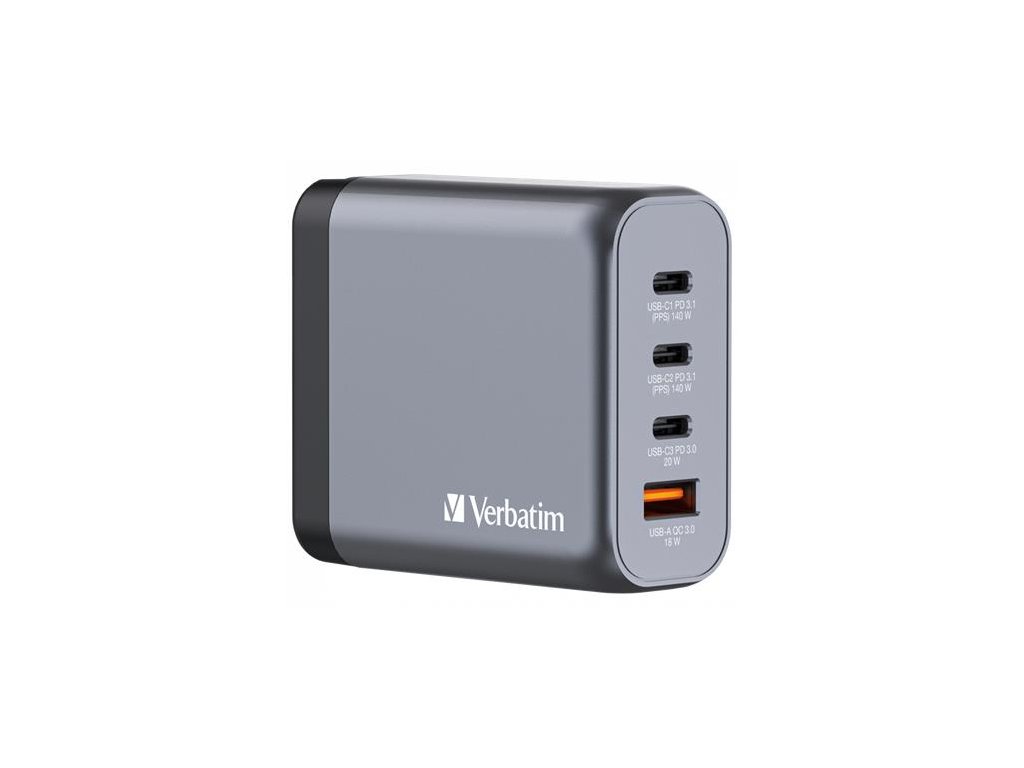 Sieťová nabíjačka, 2xUSB-C PD (140W), USB-C PD (20W), USB-A QC 3.0, EU/UK/US, GaN, VERBATIM