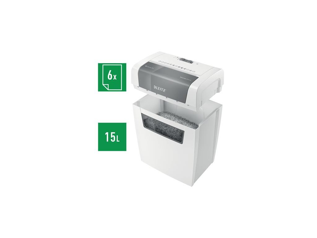 Kompaktné rozmery pre jednoduché umiestnenie, ideálne pre domácnosti a domáce kancelárie. Vneste štýl do svojej pracovne s týmto tichým skartovačom.-skartuje naraz 6x A4 listov (80 g/m²) -rez na častice (bezpečnostná úroveň DIN P-4) -odpadová nádoba s kapacitou 15 l (cca 125 listov A4) -tichá prevádzka skartovania (pri pravidelnom používaní olejovacích listov Leitz) -skartuje aj sponky a kancelárske spinace -3 minúty nepretržitej prevádzky -rozmery: 325 x 343 x 229 mm (š x v x h) -hmotnosť: 3,5 kg