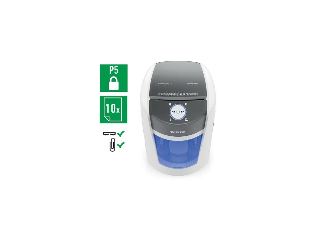 Už za obyčajných 10 sekúnd skartuje až 10 listov papiera A4 (80 g/m2) na vysoko bezpečné (P5) mikročastice.Inovatívna technológia rotujúceho koša (BRT) zvyšuje jeho kapacitu o 33 % a výrazne znižuje možnosť spôsobenia neporiadku pri vysýpaní. *Leitz IQ OptiMax testovaný so skartovačkami s technológiou otočných košov a bez nej.