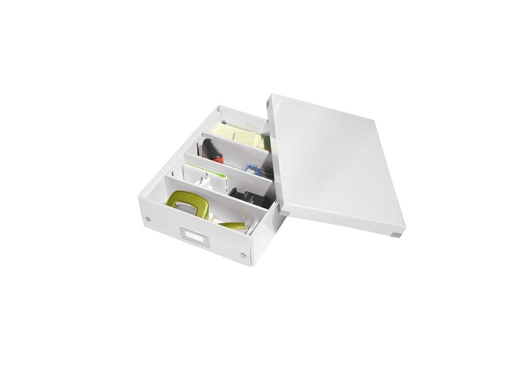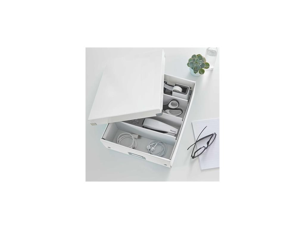 - lesklé PP vyhotovenie vytvára prvotriedny vzhľad škatule a umožňuje dlhodobé používanie a jednoduché utieranie prachu - rozmery: 280 x 100 x 370 mm - atraktívna a štýlová škatuľa na uloženie a organizáciu nabíjačiek, káblov, kancelárskych potrieb a ďalších predmetov - na vylepšenie usporiadania obsahu škatule použite priložený vnútorný systém priehradiek - škatuľu môžete rozdeliť na 2 alebo 3 časti a zabrániť tak zamotaniu káblov alebo miešaniu fotiek a ďalších drobností - kvalitné kovové rámčeky s kontrastnými bielymi štítkami na jednoduché rozpoznanie obsahu škatule - skladacia kvôli úspore miesta, ak sa nepoužíva - vyrobená z pevného vysokokvalitného kartónu Značka: LEITZ Výrobca: Esselte Kft. Adresa: 1139 Budapest, Lomb u. 37-39. A ép. II. 8., Hungary Web: https://www.accobrands.com/brands/ Email: hungarymarketing@acco.comDodatočné parametre