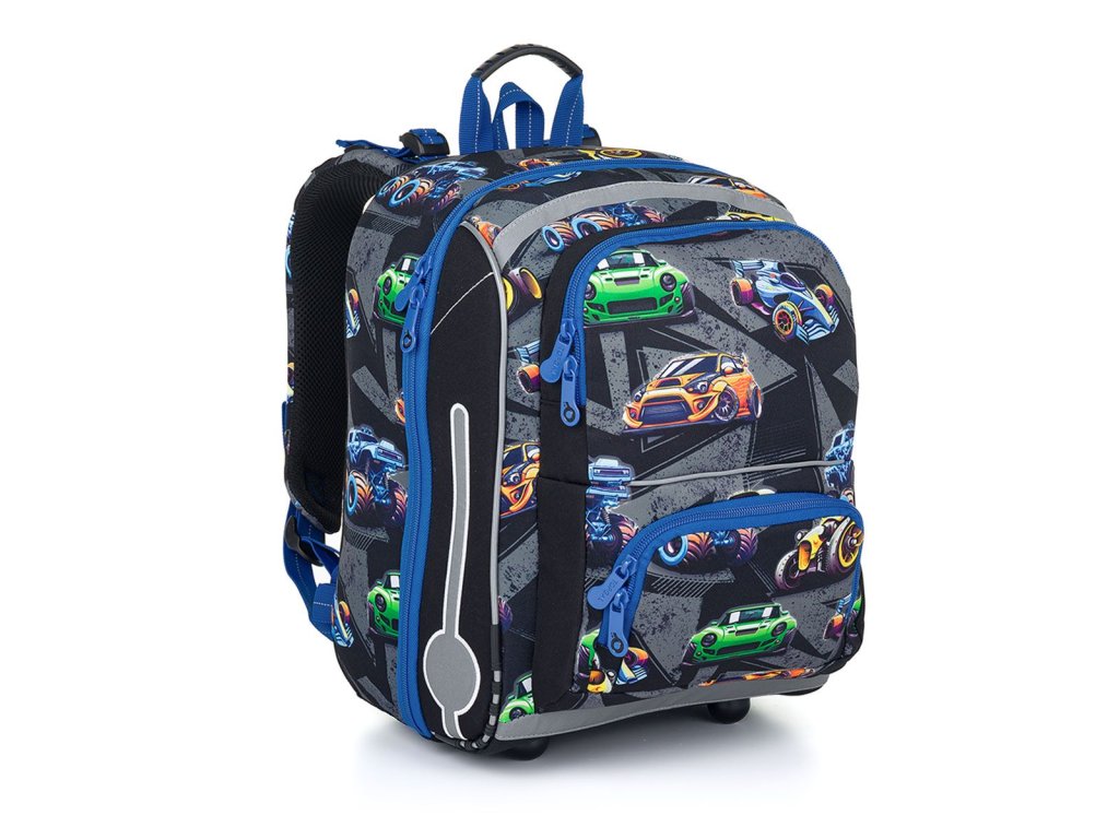 Model BEBE je kompromis medzi aktovkou a školským batohom, ktorý je vhodný pre školákov s výškou od 110 cm. Rýchle a nadupané autá dopĺňa prívesok v tvare pneumatiky.