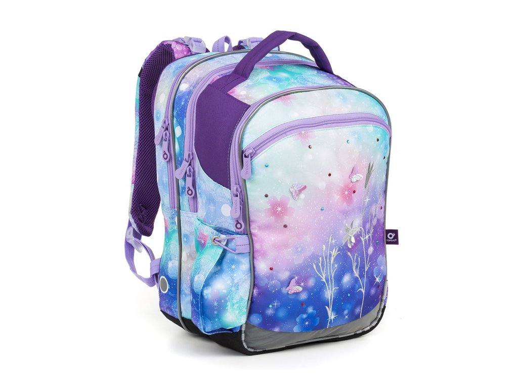 Náš najuniverzálnejší strih tašky sme obliekli do modrých a fialových odtieňov a doplnili striebornou výšivkou, motýlikmi a trblietkami. Tak čo, páči? Všetkým malým princeznám určite áno! Obľúbený strih ocenia drobné dievčatá v prvej triede, ale aj školáčky vo vyšších ročníkoch prvého stupňa ZŠ.