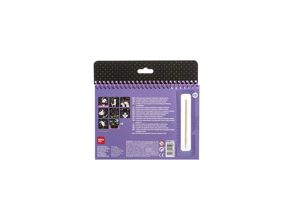 APLI Kids: umenie škrabania! Škrabací zošit so vzorom jednorožca. jednoduché a úžasné použitie: stačí poškrabať list dreveným škrabadlom a farby ožijú každý list obsahuje vzor kresby, no nové línie a motívy si deti môžu nakresliť aj sami ideálny spoločník na cesty podporuje kreativitu, zlepšuje precizitu, jemnú motoriku a koncentráciu odporúčaný vek dieťaťa: od 3 rokov Obsah sady: 8 ks obrázkov so vzorom jednorožca 1 škrabka Bezpečnostné upozornenia: Môže obsahovať malé časti. Nebezpečenstvo udusenia. Môže sa používať pod dohľadom dospelej osoby.Dodatočné parametre