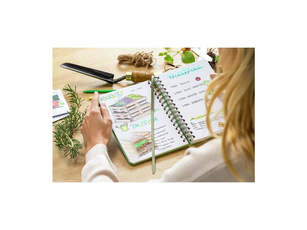 Špirálový zošit s tvrdou obálkou, s motívom záhrady -matný motív - čierna špirálová väzba -mikroperforované listy -240 čistých strán -120 g biely papier -vrecko na zadnej stane obalu -70% používaného materiálu s certifikátom FSC -vegánsky produktZnačka: SIGEL