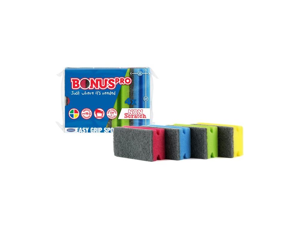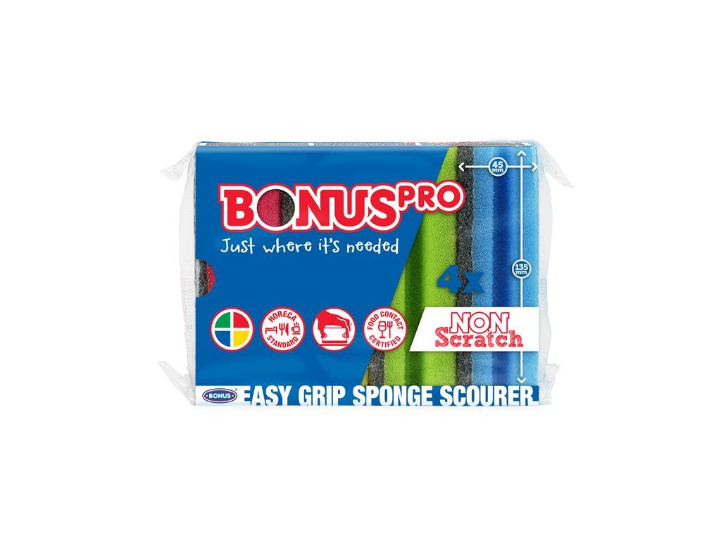 Tvarovaná špongia špeciálne prispôsobená požiadavkám segmentu HoReCa. Farebne kódovaný čistiaci prostriedok podľa HACCP predpisov pre profesionálne čistenie. Zodpovedá FCC (Food Contact Certified) certifikátu, a preto je ideálnou voľbou pre profesionálnych používateľov – reštaurácie, hotely, cateringové služby, nemocnice, verejné inštitúcie. So sivou abrazívnou vrstvou umožňuje bez poškriabania odstrániť aj suché, aj už navlhčené nečistoty. Trvácna, extra veľká (135x71x45 mm). 4 ks/balZnačka: BONUS