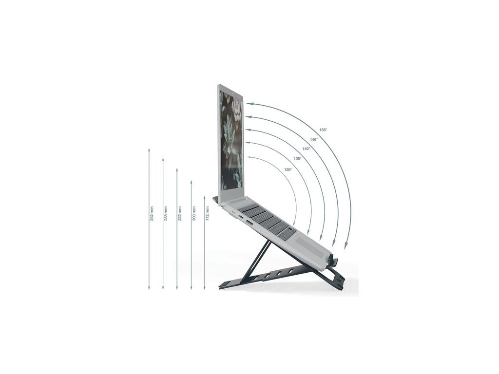 Vhodné pre notebooky a tablety vo veľkosti 10–17" (s MacBookmi, ktoré sa otvárajú do uhla max. 135 stupňov, možno používať pri nastavení výšky 172 a 200 mm)