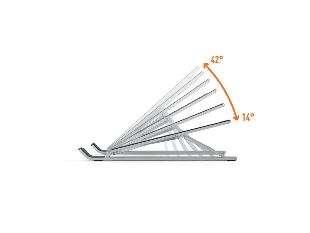 Univerzálne nastaviteľný stojan pre notebooky a tablety do 15". - priestorovo úsporné skladacie a mobilné - nastaviteľná výška a uhol čítania zaisťujú ergonómiu a pohodlie - maximálna nosnosť: 5 kg - umožňuje použitie notebooku ako pracovnej plochy (v kombinácii s externou klávesnicou a myšou) - protišmykové gumené podložky chránia pred poškriabaním - lepší odvod tepla - s praktickou taškou na prenášanieDodatočné parametre