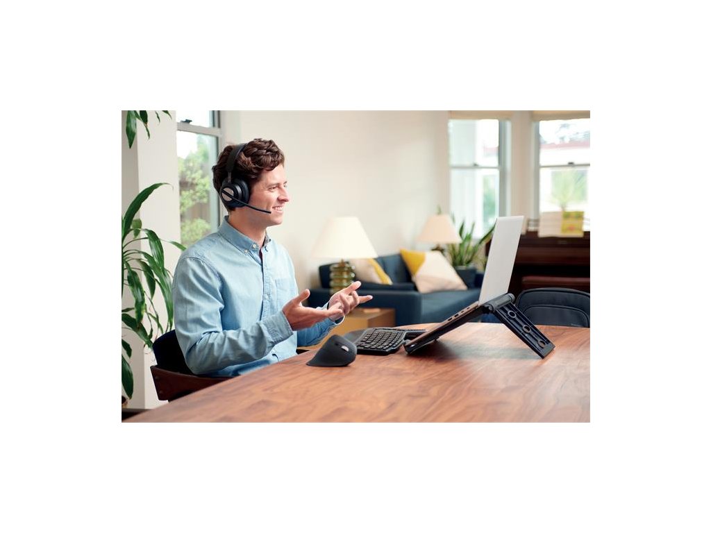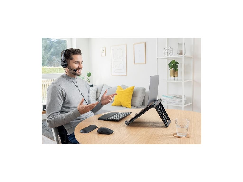 Pre hybridných zamestnancov, ktorí hľadajú prenosné ergonomické riešenie, ako aj pre organizácie požadujúce udržateľné riešenia, je stojan na notebook SmartFit® Easy Riser™ EQ ideálnou voľbou. Tento stojan zlepšuje ergonómiu pracovných staníc a prispieva k efektívnejšej práci. Vyrobený je z 50 % z materiálov recyklovaných po spotrebe (PCR), čím pomáha znižovať náš vplyv na životné prostredie. Patentovaný systém SmartFit® umožňuje nastaviť výšku a sklon obrazovky notebooku na zmiernenie záťaže chrbta, krku a očí. Podporuje prúdenie vzduchu, čím zlepšuje výkon batérie, a pri cestovaní ho možno zložiť na plochý tvar.