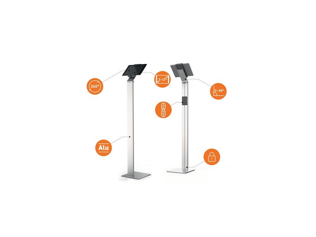 Vďaka svojmu elegantnému vzhľadu sa tento držiakstojan na tablet hodí do každého prostredia. kompatibilný s tabletmi: 7 "-13" dá sa otvárať symetricky medzi 160-275 mm tablet sa ľahko vkladá a vyberá 360 ° otočný, možno použiť na výšku aj na šírku v spodnej časti držiaka je otvor, kam je možné pripojiť nabíjačku kanál na kábel je možné nastaviť spolu s káblovým vedením v ľubovoľnej výške dodávané s USB káblom uzamykateľné špeciálnym kľúčom pohodlné riešenie proti posúvaniu tabletu do strán dodatočná ochrana proti krádeži pomocou káblového zámku (nie je súčasťou dodávky) nastaviteľný uhol čítania od 0 do 88 stupňov rozmery: 270 x 1215 x 270 mmDodatočné parametre