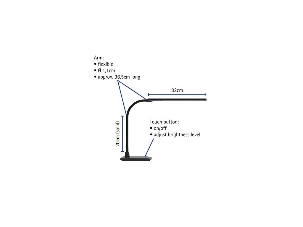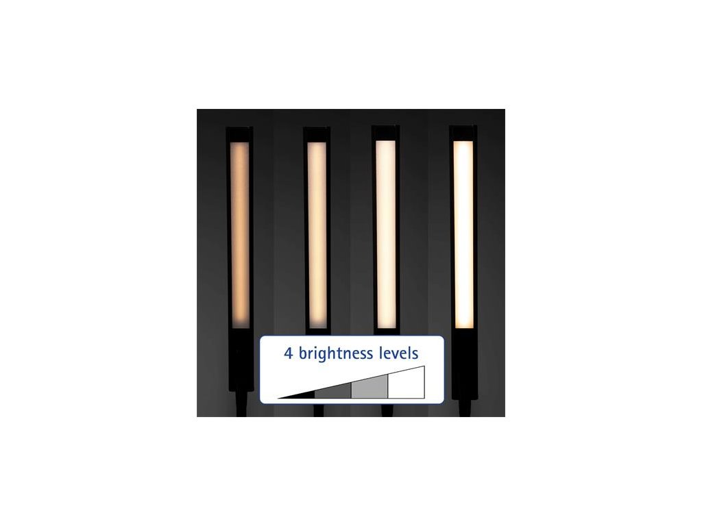 Energeticky úsporná stolová lampa vyrobená najnovšou technológiou LED. Ovládanie jasu, ktoré možno prispôsobiť aktivite a individuálnym potrebám. Čistý, decentný dizajn, harmonicky zapadá do priestoru. - svetelný zdroj: vstavaný LED panel, LED žiarovky sú vymeniteľné v tele svietidla - intenzita svetla: 726 lumenov, nastaviteľná v 4 úrovniach - osvetlenie: 1120 luxov vo vzdialenosti 35 cm - so stmievateľným dotykovým spínačom pre zníženie odtieňov - teplota farby: 3000 Kelvinov, teplá biela - priemerná životnosť LED: 50 000 hodín - priemerná spotreba energie: 6 kWh/1000 h - materiál ramena: kov, pogumovaný - materiál hlavy: hliník - dĺžka ramena: 38 cm - dĺžka hlavy: 32 cm - výška: 37,3 cm - hlava a rameno sa dajú naklápať a otáčať - vážený plastový podstavec, rozmer 16,7 cm x 12 cm - dotykový vypínač na podstavci - funguje zo siete 220/240 V - farba: čierna - záruka: 2 roky - hodnotenie energetickej účinnosti: E ??(na stupnici A-G)Dodatočné parametre