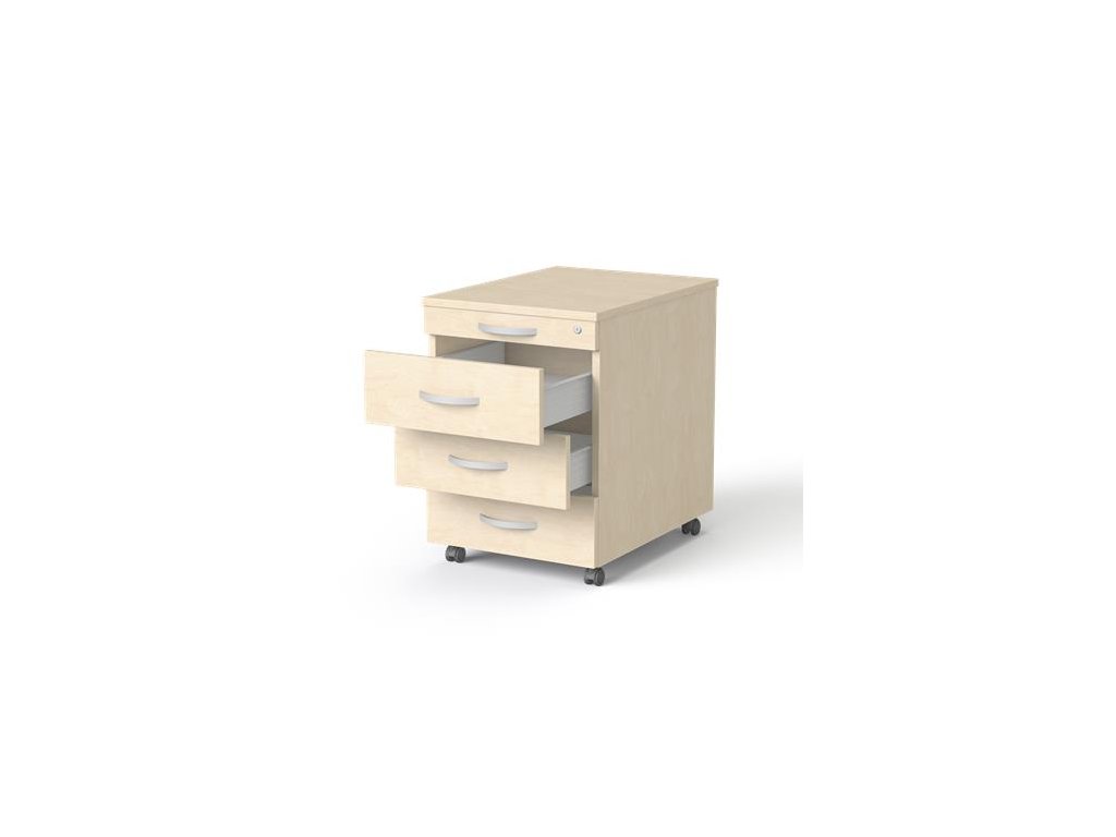 šuflík so štyrmi zásuvkami na kolieskach s centrálnym zamykaním s kovovým zásuvkovám systémom rozmery: 600x580x430mm hrúbka vrchnej časti, spodnej časti a bočných stien: 18mm dodávame zmotnované! dekor: javorDodatočné parametre