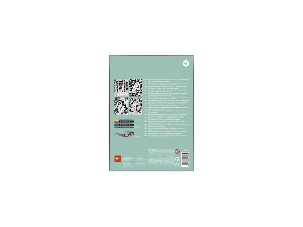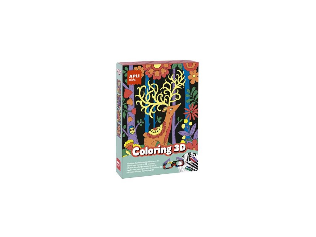 Súprava na vyfarbovanie s efektom 3D APLI Kids je ideálna na rozvíjanie kreativity už od útleho veku! Stimuluje jemnú motoriku, koordináciu oko-ruka, kreativitu a priestorovú orientáciu. Po vyfarbení si môžete pozrieť čarovný efekt pomocou 3D okuliarov. Teplé farby (červená, oranžová a žltá) sa objavia skôr ako studené farby (fialová, modrá a zelená). Sada obsahuje: - 4 farebné ilustrované karty - 6 fixiek (žltá, oranžová, červená, zelená, modrá, fialová) - 1 pár 3D okuliarov so špeciálnymi šošovkami. Vhodné pre deti od 5 rokov.Dodatočné parametre