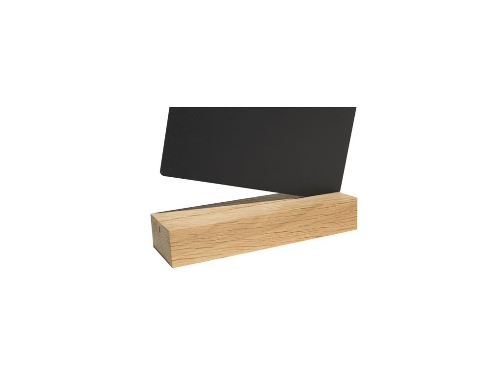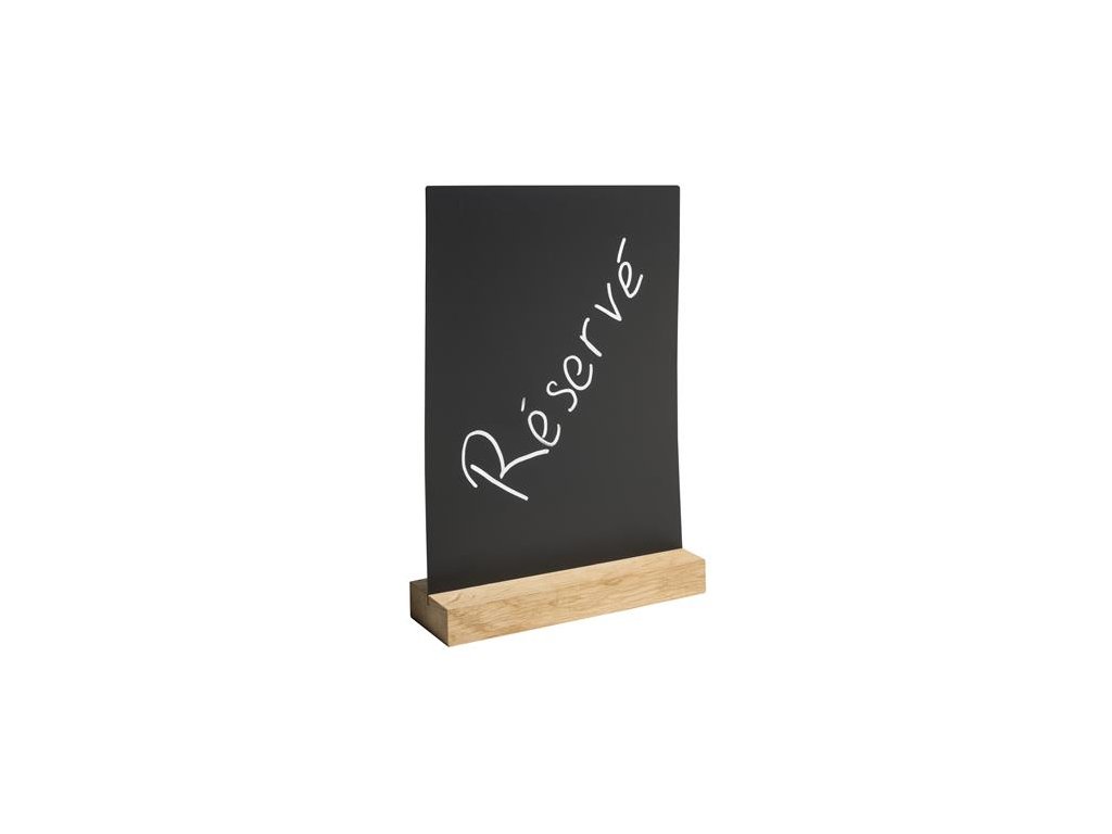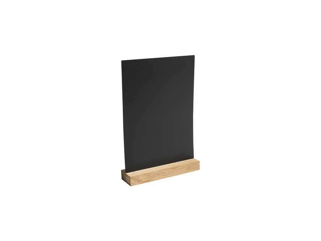 Ideálny na vystavenie jedálnych lístkov, cien či ponúk na stole. -vyrobený z ABS plastu -vhodný na písanie kriedou alebo kriedovým popisovačom -obojstranný -zvislá orientácia -podstavec z dubového dreva -rozmery: 210 x 52 x 297 mmDodatočné parametre