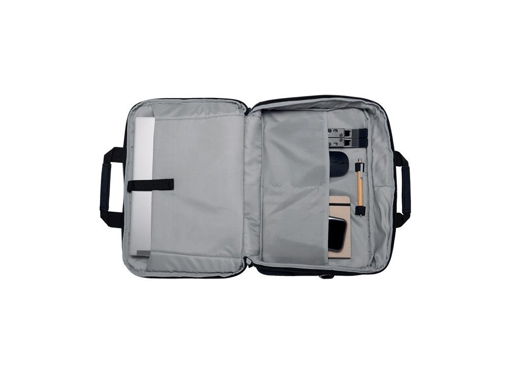 EQ taška na notebook je ideálnym riešením pre profesionálnych používateľov, ktorí hľadajú cenovo dostupnú a udržateľnú tašku vhodnú na cestovanie. Táto taška je vyrobená z 52 % recyklovaného polyesteru (PCR) z 23 x 250 ml plastových fliaš. Je to moderná a cestovateľsky prívetivá taška s polstrovaným priečinkom, vhodná pre notebooky do 16" (vrátane 15,6" notebookov). Predné vrecko na zips a viacero vnútorných vreciek umožňujú ľahký prístup k dokumentom a príslušenstvu. Polstrovaný ramenný popruh zaisťuje pohodlie pre krk a ramená, a upevňovací pásik umožňuje jednoduché prichytenie na kolieskovú batožinu. Plne otvárateľný dizajn uľahčuje bezpečnostnú kontrolu.