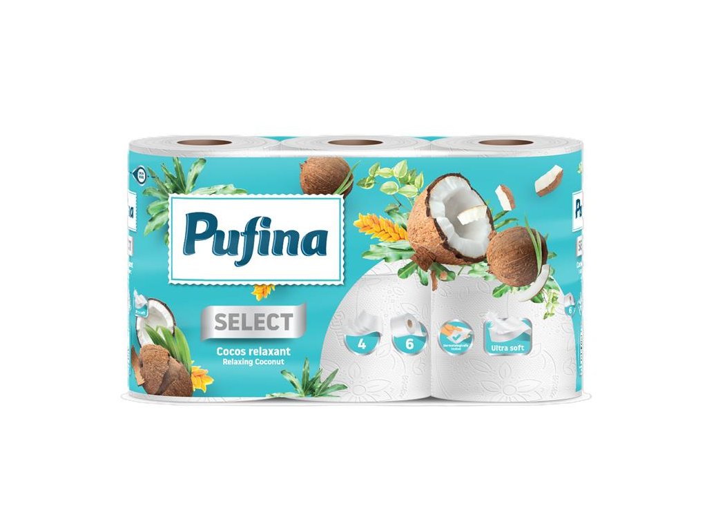 Toaletný papier, 4 vrstvový, malé rolky, 6 roliek, PUFINA "Relaxing Coconut", s kokosovou vôňou